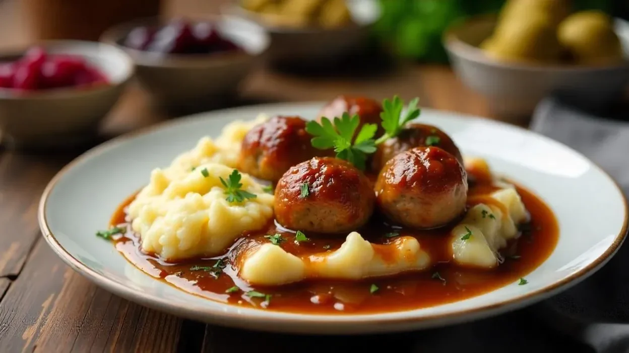 Traditional Finnish meatballs (Lihapullat) served with creamy mashed potatoes, brown sauce, and Scandinavian side dishes in a cozy kitchen setting.