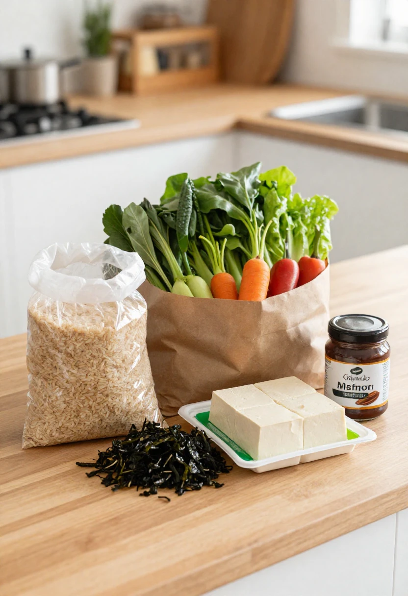 A balanced macrobiotic meal with brown rice, miso soup, steamed vegetables, tofu, and sea vegetables served in ceramic bowls on a wooden table